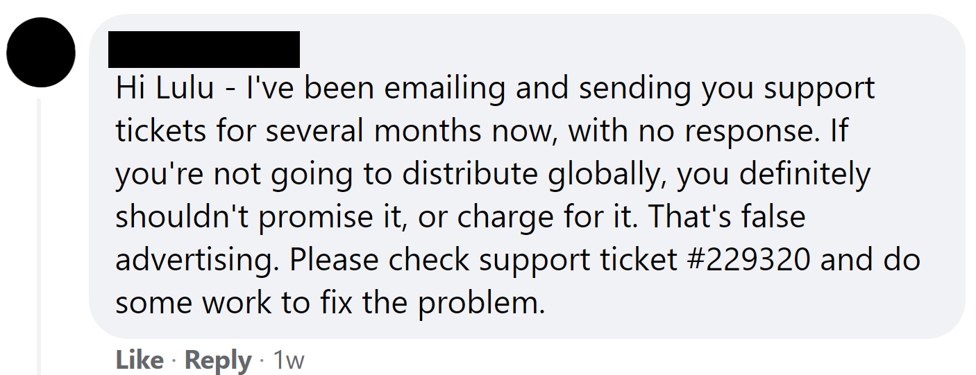 “I’ve contacted Lulu three times and still no answer. Support is nonexistent.”