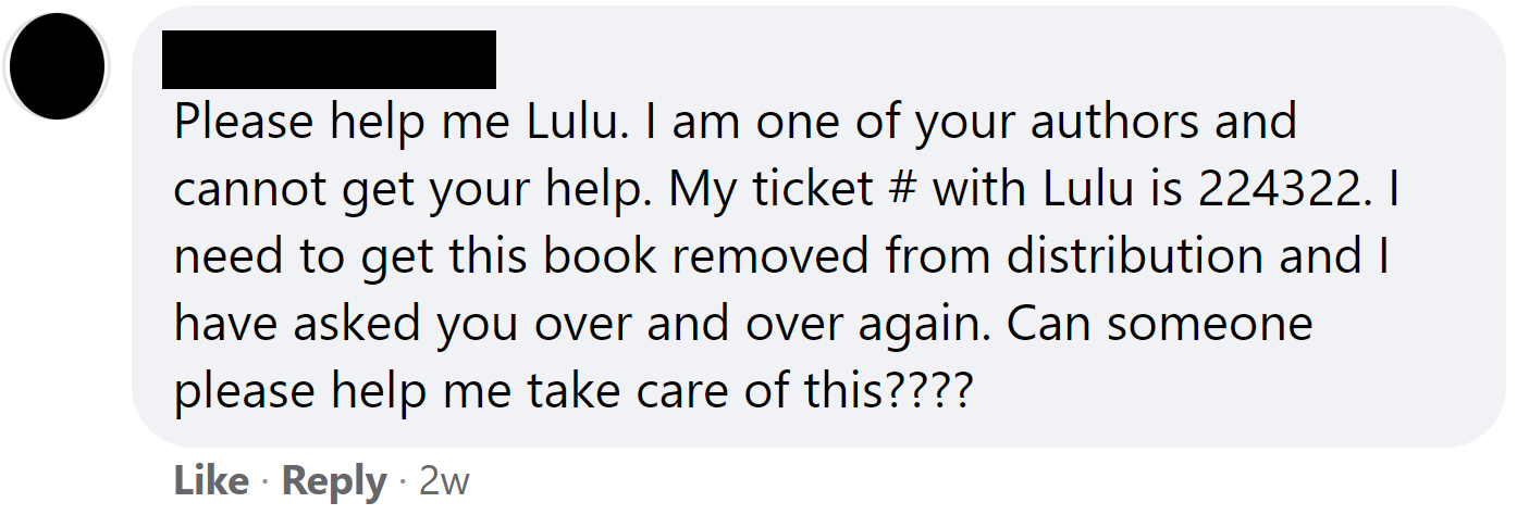 Under some complaints about Lulu Press posted online, you can read Lulu’s responses. Again, if they’d handled the complaints directly, when their authors first “opened tickets” with them, there would not be so many public complaints posted about them online.