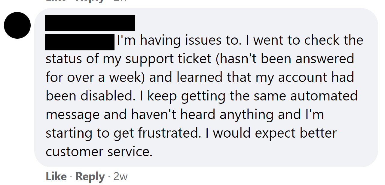 “I’m considering deleting my account and going elsewhere because this is absolutely ridiculous. It’s sad that I have to leave a complaint on the BBB to receive a response instead of just receiving a response to my ticket.”