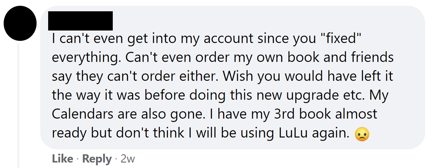 “Lulu used to be an excellent site. Something changed in 2020 and it has a fraction of the publishing features it once offered… Then, there is the not so small matter of customer service. They purely don’t seem to care, even when you have been using them for several decades and have over fifteen books on their site. Wish I could jump ship.”
