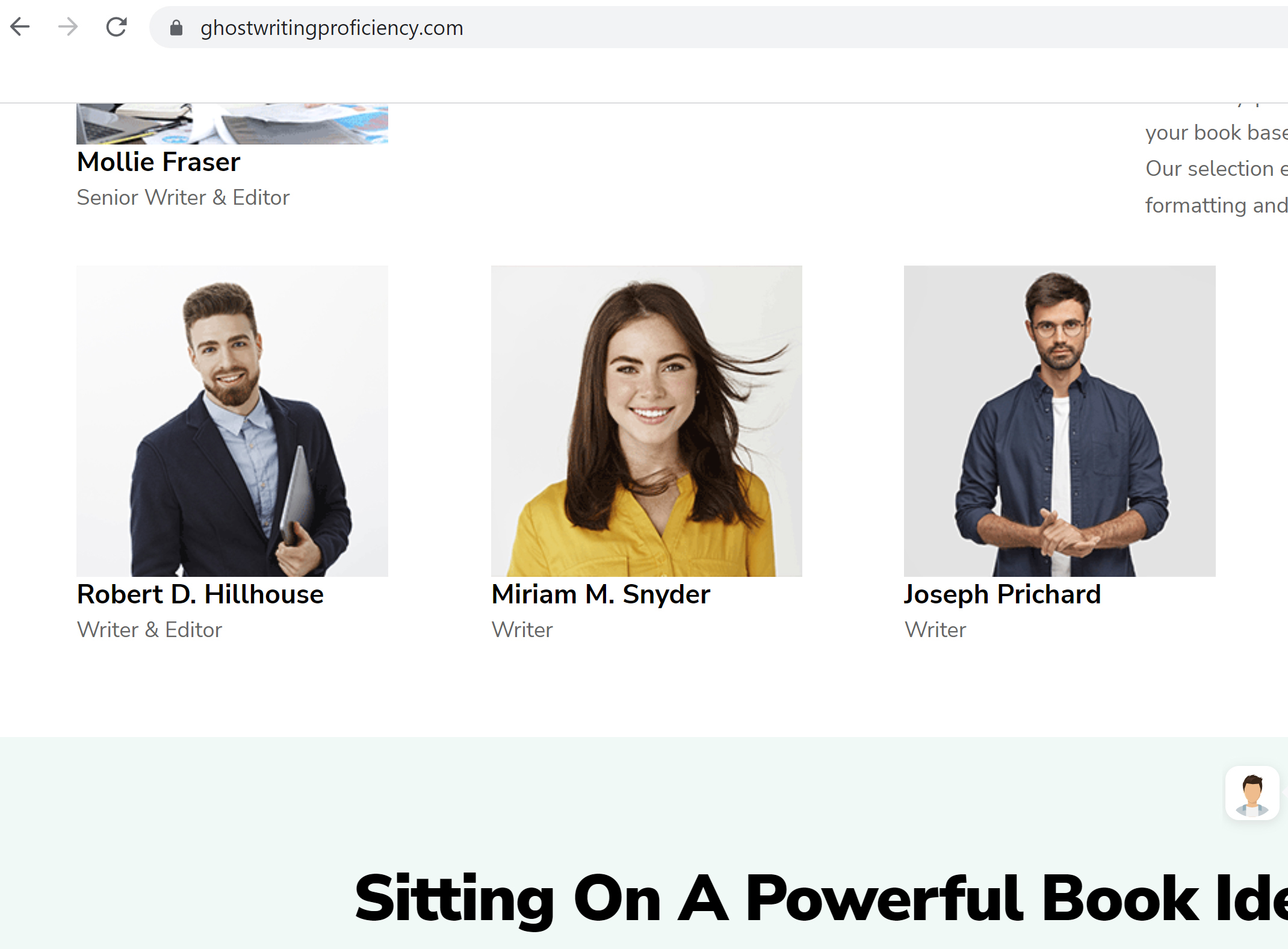 Now, check out the “team” photos on their website. Those people look darned near perfect, huh? There’s a reason for that! Right click to save those people’s images, and then upload those to Google’s image search option. You’ll find that the images are from stock photo agencies. In other words, those images may be of real people but those folks are models. They don’t work for that “ghostwriting” company. Don’t worry. You don’t have to do the Google search because I already did it for you! 🙂
