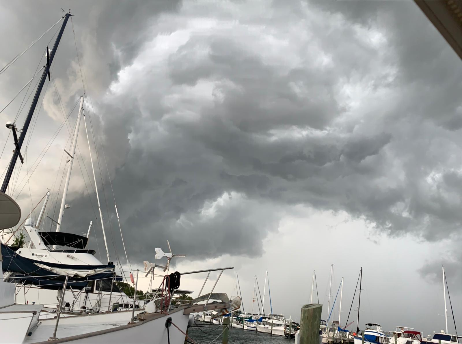 I also wanted to share with you a photo of the amazing (and downright scary) storm we had earlier this week. After heeling over in the initial burst of wind, No Tan Lines (“Tanny”) fared very well. However, last night, we had another humdinger and she heeled and lurched to port so hard at one point that I thought we’d lost a line, and were about to hit our neighbor. That did not happen, thank goodness.