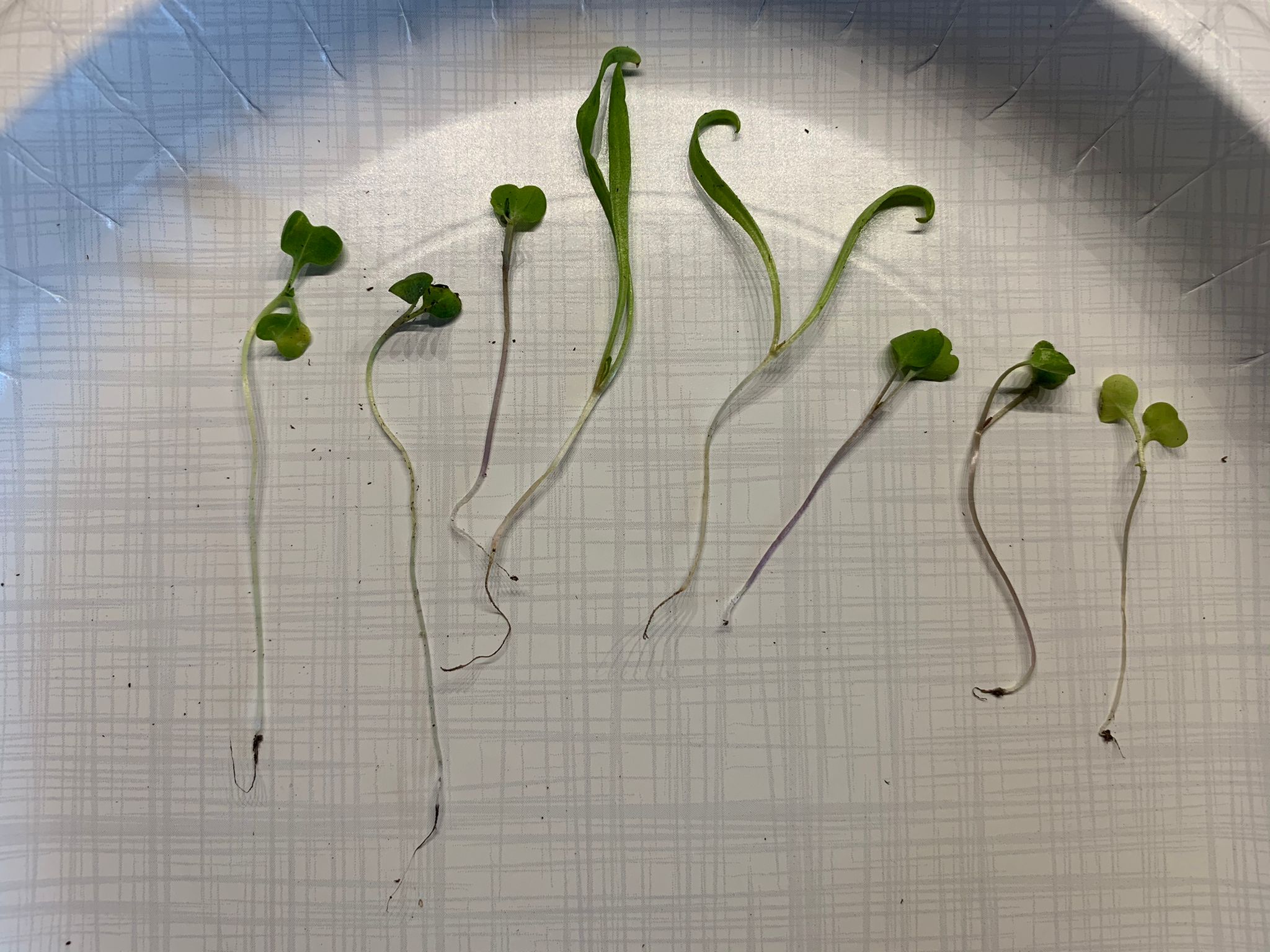 They germinated right away. I carefully checked on them daily, spritzing them with water, and lovingly watching them grow and grow. The problem was each plant only had two leaves at the top and very long stems. No other leaves came out but the stems kept growing!