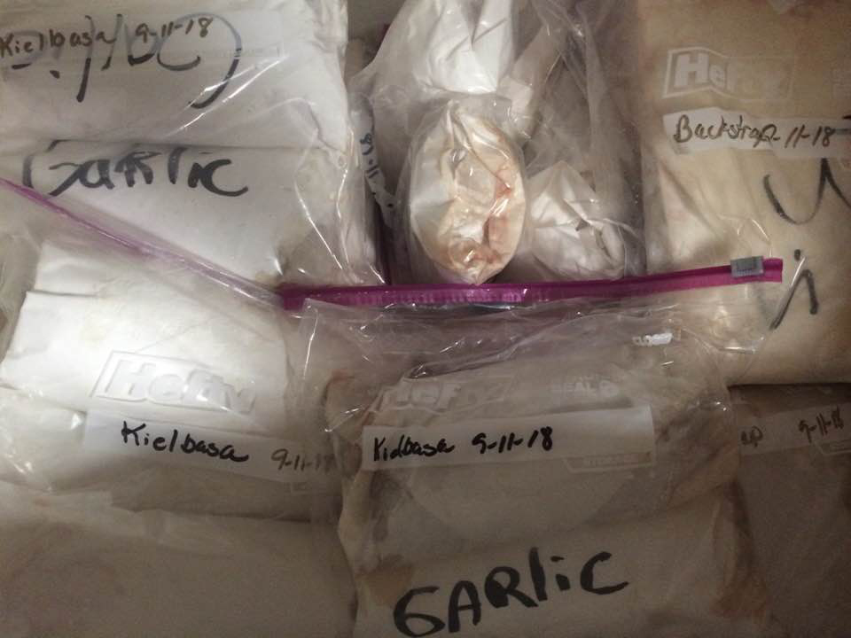 After breakfast, Blaine and Silas loaded our pork into the huge cooler we’d brought with us. We put the cooler and our bags in the truck, and headed to Tampa. Once there, we dropped off the meat at Cacciatore Bros, an Italian grocery store that processes meat for hunters. Later that evening, they called us. They were already finished! The next morning, we picked up 87 lbs. of sausage (!!!), several packages of backstrap, roast, and ribs. Lots and lots of ribs. Everything was wrapped in freezer paper. Once we got the meat loaded on the boat, we put it all in Ziplocs, labeled those, and posted a note on our Dock 4 Facebook page, telling everyone to come pick up their pork.