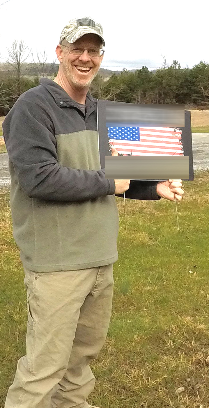 Based on conversations we had with Psycho before he showed his true colors, we knew that he wasn’t, shall we say, a patriotic person. So, Brian put this in our front yard: