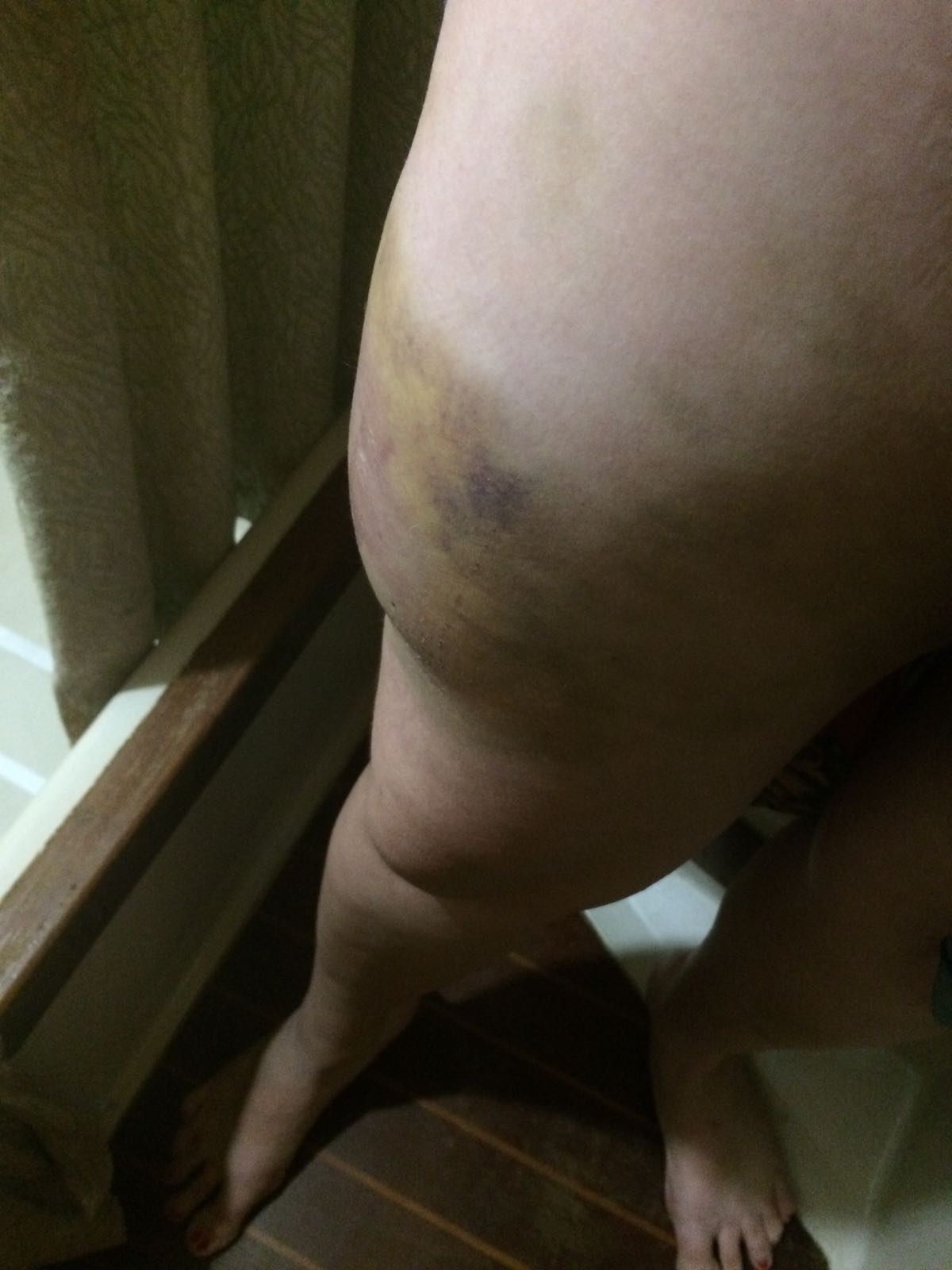 Last week, I shared photos of my injuries from falling off our boat. This past Saturday, it wasn’t any smaller and was, in fact, larger. I found a sports medicine place in Tampa that was not only open on Saturday, but also had an urgent care center on site, so off I went.