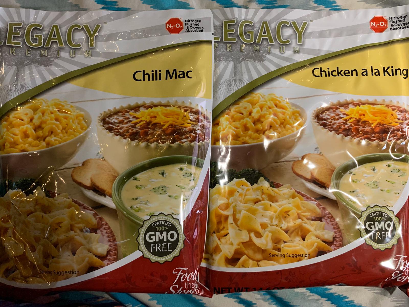 He will be adding canned ground beef and diced tomatoes to the Chili Mac, and some canned veggies to the Chicken a la King. Yummy!!