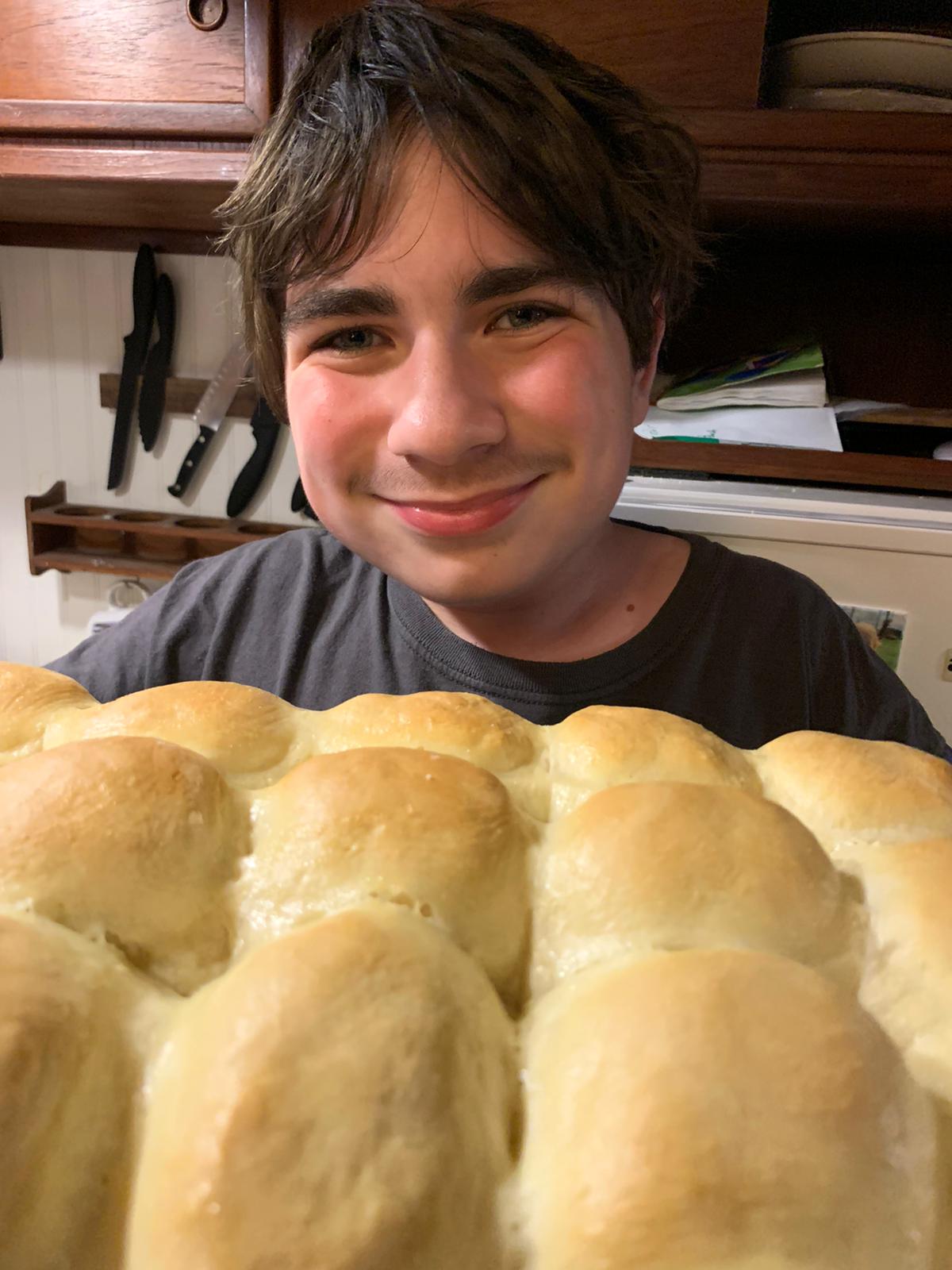 Max (age 18) has been receiving endless accolades over his baking skills for the past two weeks. Yesterday, Mason (age 13) decided to challenge Max in the homemade bread department. He asked me to obtain our daughter’s famous Thanksgiving dinner roll recipe. I did. Mason then spent two hours in the kitchen and this was the result: