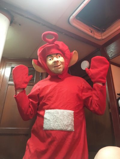 A package arrived via UPS one day last week with Max’s name on it. He’s 18 and orders his own stuff online now so I didn’t give it much thought. I gave him his package and then went to work in the aft stateroom (the bedroom – nothing really “stately” about it). Then, I was stunned silent and then doubled over in laughter when a 6′ 3″ Teletubby with Mr. Bean’s face entered!