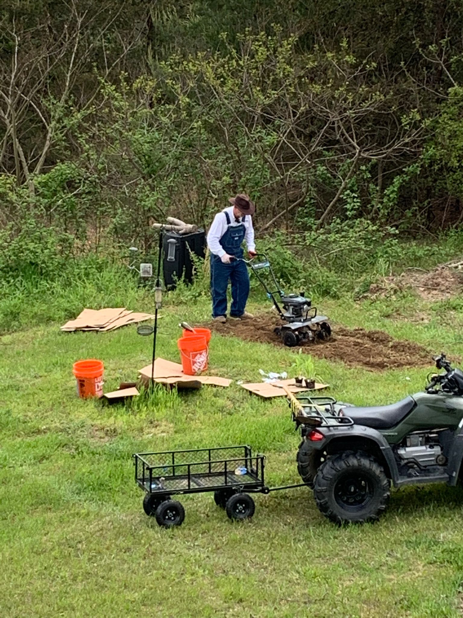 So, with several corn seedlings at the ready (they’re bursting out of their pots), Brian started tilling the new “corn field” today, and making videos for the grandbabies so they can see how it’s done.