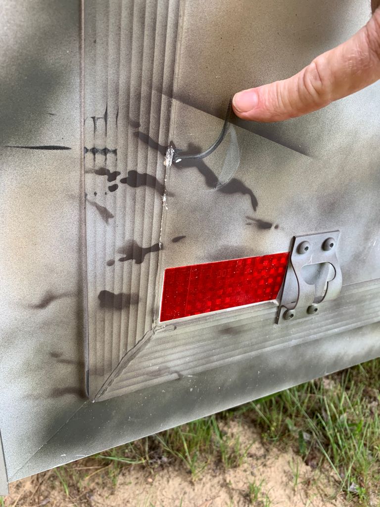 Mason and I pulled into the traffic, and caught up with Brian, who had pulled over about a half mile ahead. I pulled in behind him. He got out of the UHaul, and looked at the back of the trailer. He found the dent. It was on the left side of the camouflaged rear door.