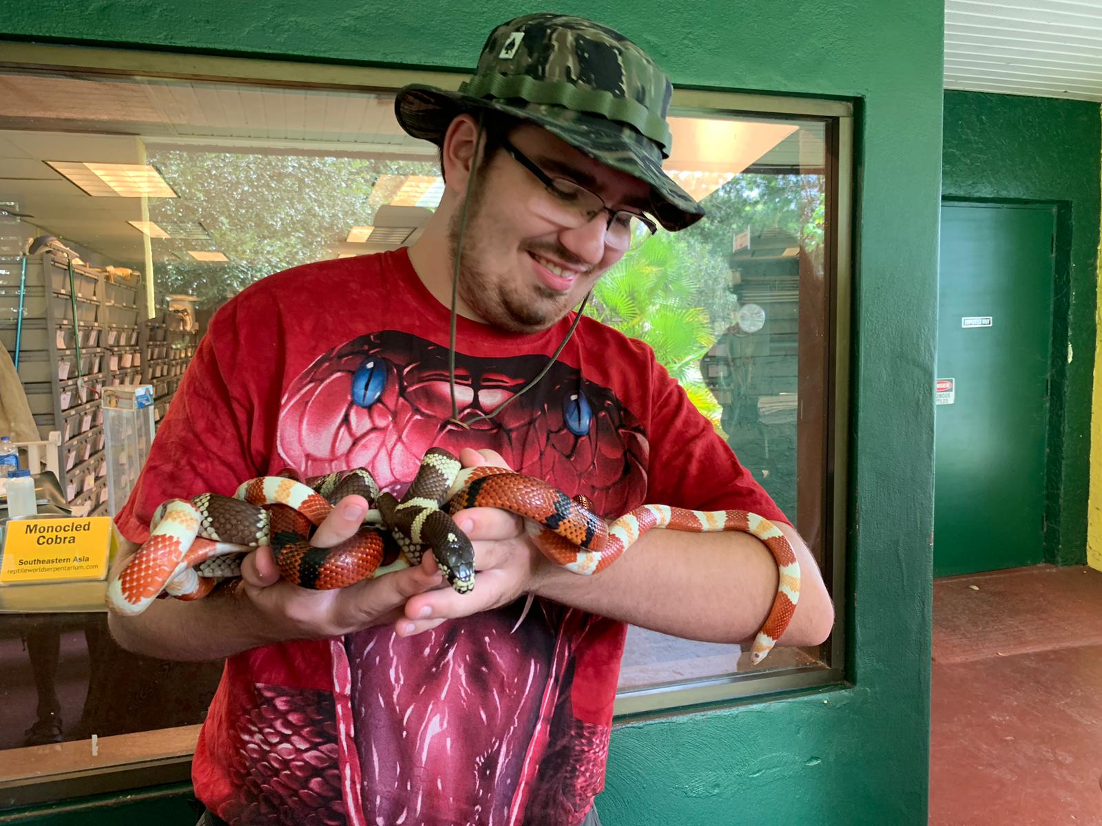 A kid showed up at the serpentarium one day with what he thought was a milk snake. George told him it was a great coral snake and they were going to buy it from him. The kid said, “It’s a milk snake. I know because it bit me twice yesterday.” The kid had been at the beach, caught the snake, got bitten, and then went to a party that night. George looked closely, and noticed the boy already had eyelid ptosis (binocular diplopia and ptosis, meaning drooping of the eyelids). They packed him in a car, and rushed him to the hospital. He survived.