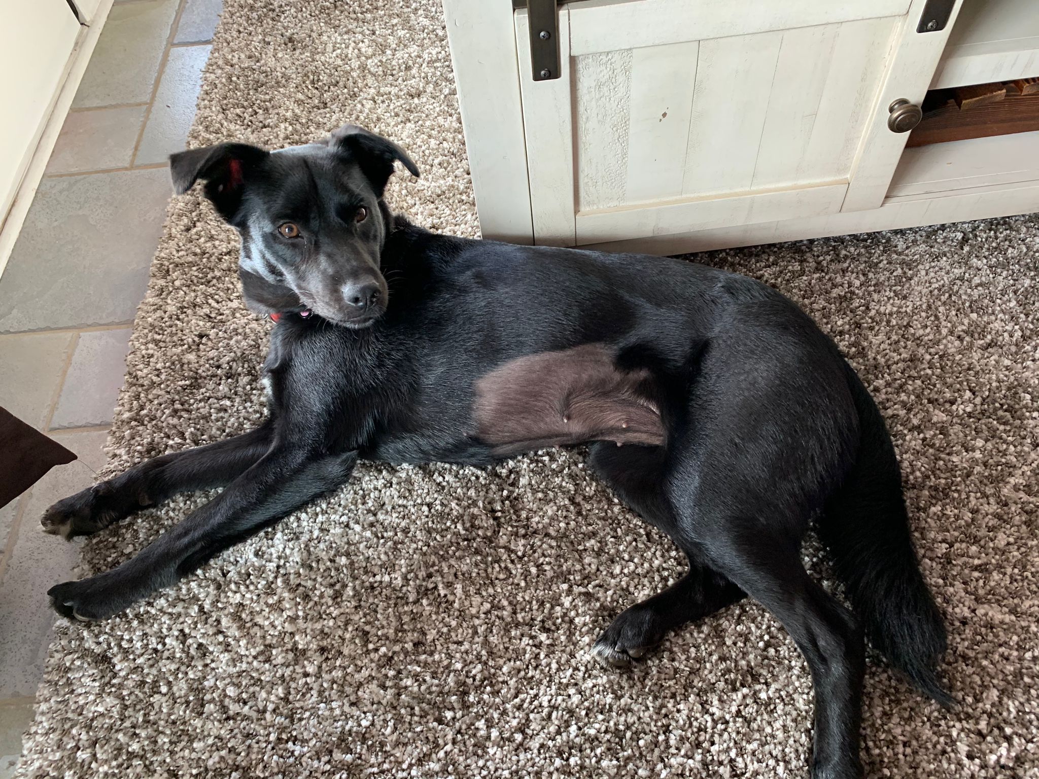Moon, enjoying her new rug. You can still see the shaved belly from her spay surgery.