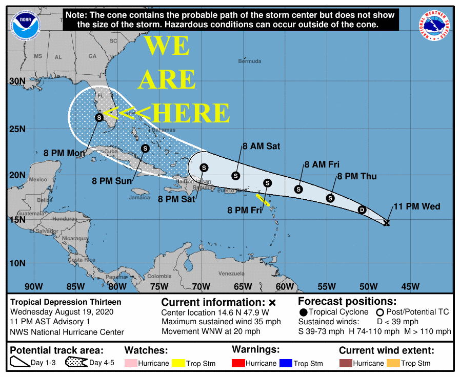 The local news is shoving doom and gloom down our throats because of Tropical Depression 13, which may turn into Hurricane Laura. At this moment, St. Petersburg is right in the middle of the cone.